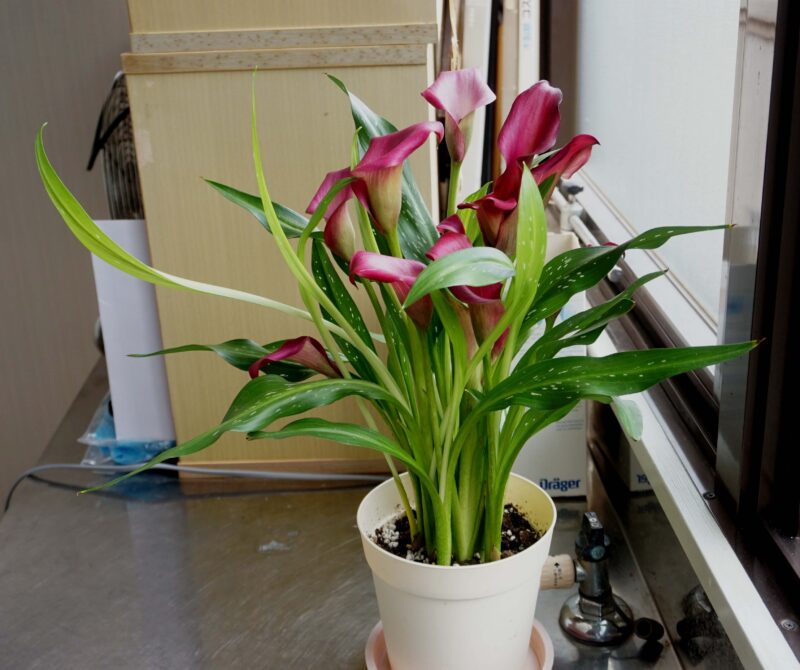 医院の窓際にカラー(calla) を飾りました。サトイモ科で、和名はオランダカイウです。原種は白花です。日本にはヒメカイウが有りますが、ミズバショウとよく似ています。カイウ(海芋)の花は、同じサトイモ科の植物(ザゼンソウ、マムシグサ、カラスビシャク、テンナンショウ) と共通です。 キンポウゲ科のクレマチスもカイウと呼ばれますが、サトイモとキンポウゲは全く別物で、どうして2つの科の植物がカイウなのか不明です。