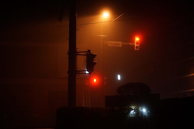 ごみ集積所の烏除けネットの回収を忘れていて、真夜中になって表に出ました。市民館前の交差点は霧に包まれていました。交差点の夜はカラー照明がにぎやかで、絵になります。