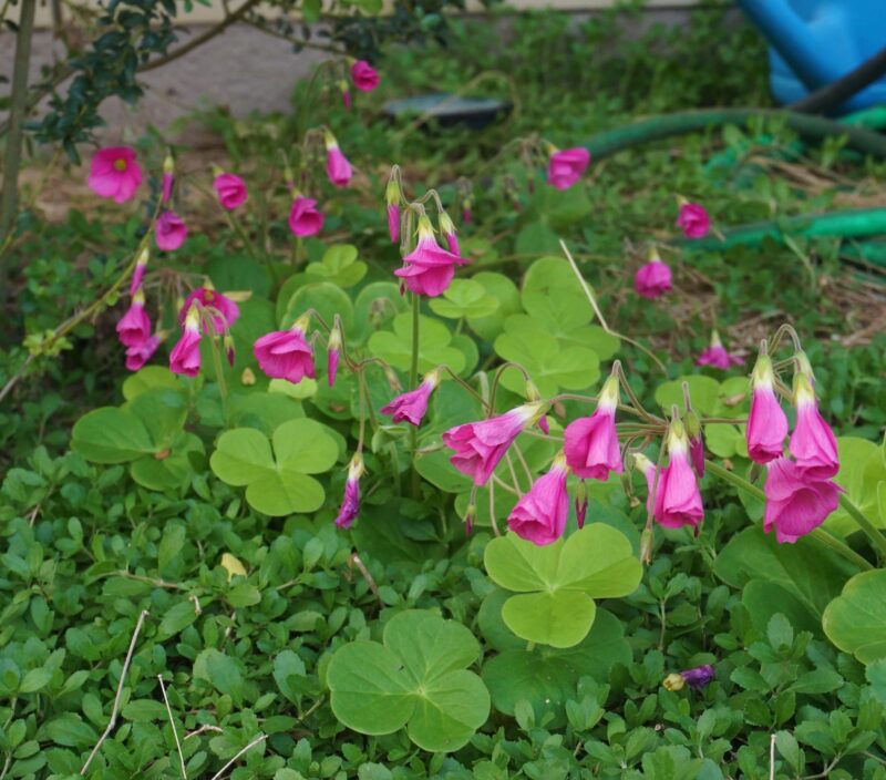 ハナカタバミは南アフリカ原産のカタバミ科の草本です。日本には黄色い花のカタバミが自生しています。カタバミの特徴は、種子がこぼれる時に遠くに飛び散ることです。種子が成熟すると、蒴果はいつ裂開しても良い状態になります。軽く触れるだけで蒴果は弾けて、内部の種子が勢いよく飛び出します。種子は小さいけれど硬いので遠くまで飛びます。不用意に顔を近づけると、蒴果に触れただけで種子が弾け飛ぶので、顔にパチパチ当たります。目に入ると厄介です。