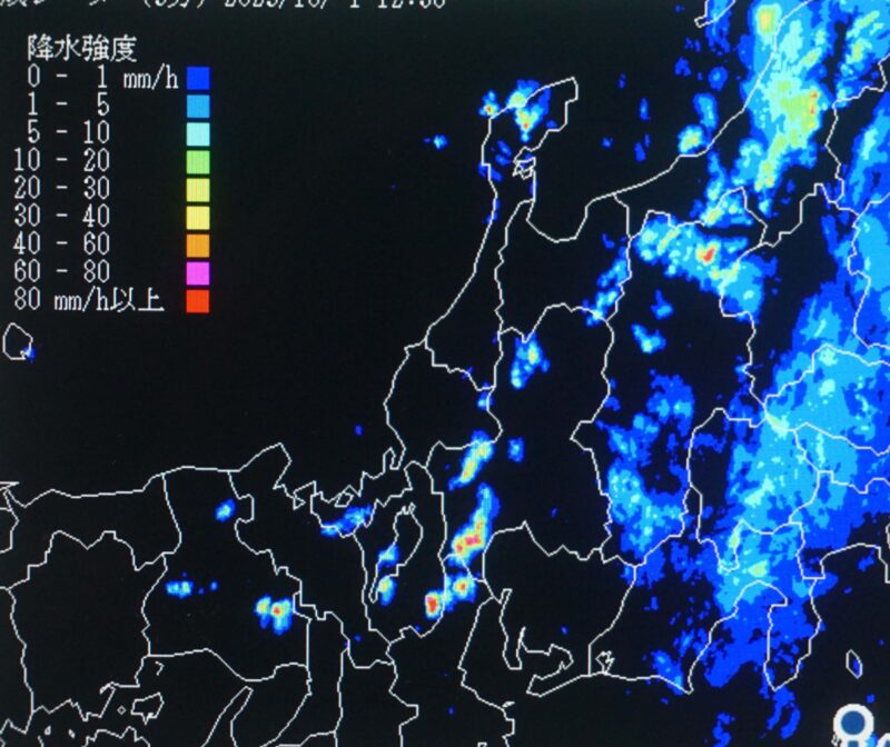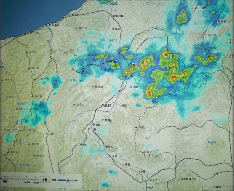 10月1日 午後0:30 雷鳴とともに強い雨が降ってきました。合成レーダー画面で、中野市付近に強い雷雲が写っています。赤いマークがそれです。ザーッと降って30分後には薄日がさしてきました。