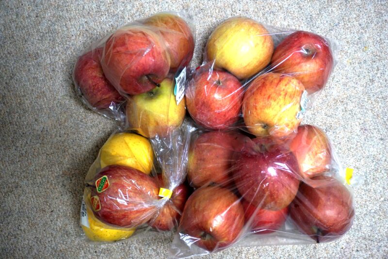 リンゴが好きで、沢山買いだめします。total 18 個で、しめて 1,480 円でした。スーパーのリンゴは大きめが 3個で 700 円でした。スーパーのリンゴは大きくて見栄えは良いのですが、ぼけていたりして味はいまいちです。産直のリンゴは@82円、スーパーのは@233円です。こうも差があるとリンゴは誰もスーパーで買わないね。そうは言いながらスーパーの方が近いので、他の買い物と一緒にリンゴを買ってしまいます。