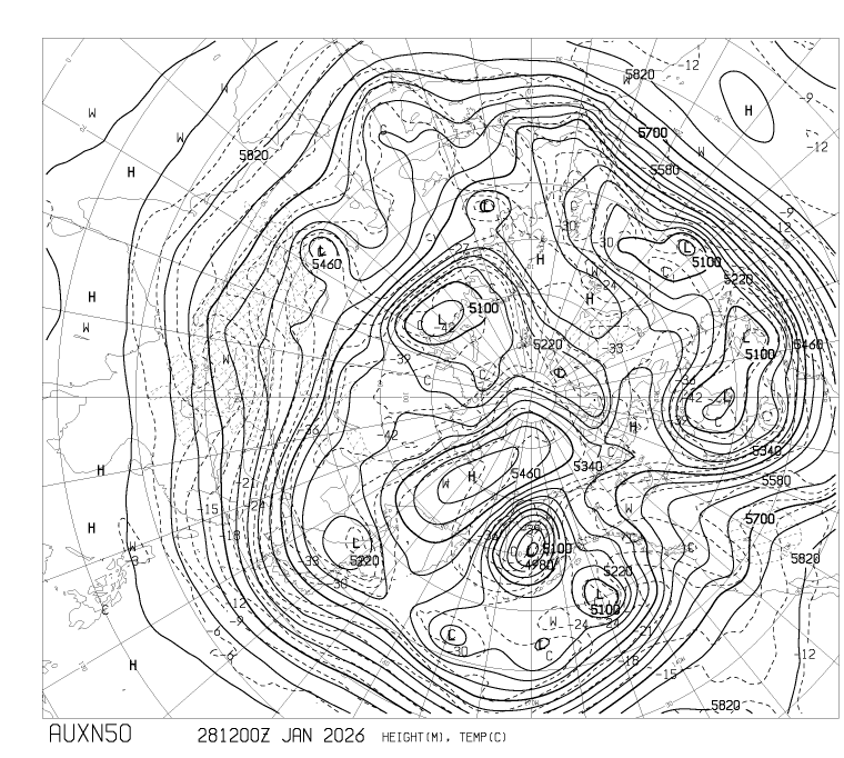 前回お示しした、北半球 500hp 高層天気図は2(3) 波型だったのですが、今日の天気図は北極振動型に変わっています。N60 ,E150に大きなHがあり、北極付近の気温が上がっていることが分ります。このパターンは、2(3) 波型に比べ日本に流れ込む北極寒気は弱いけど、それでも平年より日本列島は寒いです。暫く冬らしい気候が続くと思います。