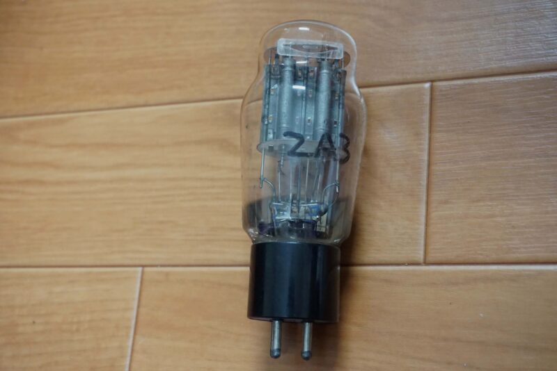 私がずっと前からもっていた UX-2A3です。大学3年生の時(1968年)から持っています。当時もうじき取り壊される予定の校舎を使って、信州大学の総合美術展を開きました。会場は松本市内の廃校になった小学校です。この真空管は、放送室にありました。放送機器は埃まみれで放置されていました。大きな小学校だったので、学校放送のアンプは本格的なものでした。2A3 ドライブ トランス結合 2本の出力管 PP でした。普通のアンプでは、ドライバーに 2A3 などの強力な真空管は使いません。全校に学校放送の信号を高音質で伝えるためには、このような強力なアンプが必要だったのです。