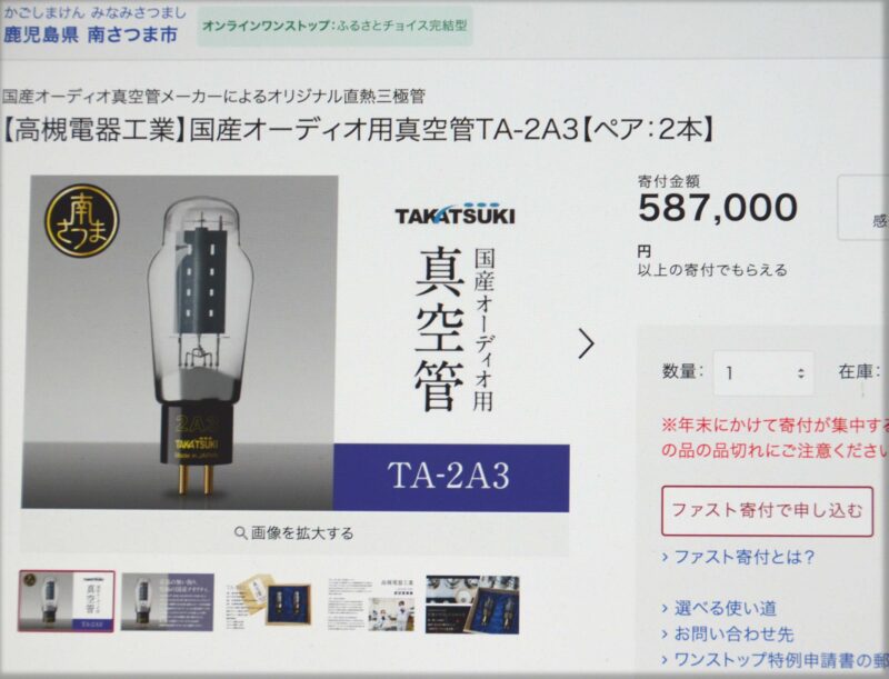 ふるさと納税の返礼品です。この真空管 2本でなんと 587,000 円です。最近の high end のオーディオ製品の値段は、目玉が飛び出ます。一方、パーツ自体の値段も天井知らずです。少なくとも、アナログの世界では昭和30年以降、進歩は殆どありません。当時、10,000 円で作れたアンプは、今はガレージ・メーカーで1,000,000 円ぐらいします。例えば、ここに掲げた TA-2A3 を2本使ったアンプは、多分 その位になるでしょう。