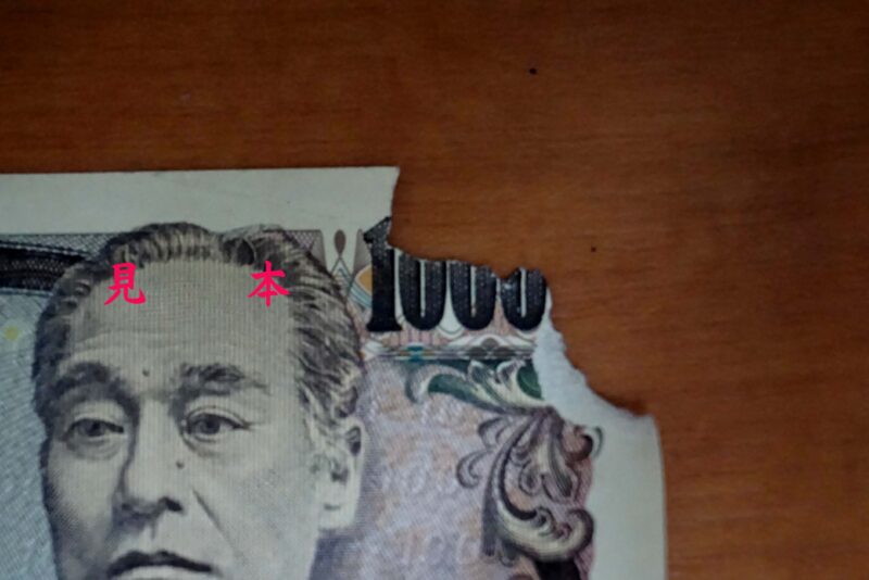 お札をスキャナーで読み取ろうとしたのですができませんでした。お札全体をデジカメで撮ろうとしても駄目です。これくらい接近してお札の一部を写すと撮れます。ニセ札を作らせないシステムが働くのです。画像に見本の字を入れました。 今回、この画像をお見せしたのは、この破れです。このお札を ATM で入金しようとしても、ATMは受け付けてくれません。勤め人はこのことを知らない人が多いです。私ら個人事業主は窓口で入金した現金を、預金口座に振り込む必要があります。こういう時は窓口に通帳と一緒に持っていtって、あれこれ書かされてやっと受け付けてくれるのです。銀行が混んでいるときは何10分も待たされて、やっと入金出来ます。 私は医院のスタッフに「こういう時は手数料取ったら」と言ってやりました。(冗談) お札を破いたら、自分の責任で銀行窓口で換金してくださいね。