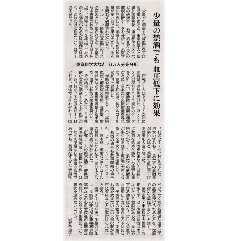 355 新聞を読んで 39 少量しか酒を飲まない人でも、断酒すれば血圧は下がる