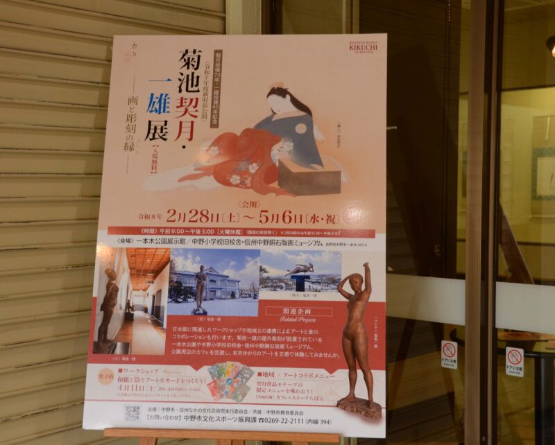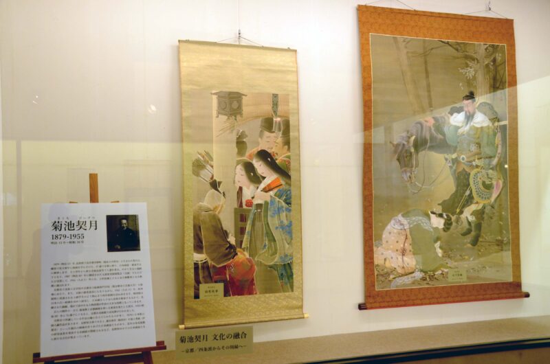 | 一本木の展示館で始まりました。契月は中野町の生まれで、旧姓は細野です。若いころに京都で画業を学びました。後に菊池家の養子となって京都画壇で活躍した、日本画の大家です。