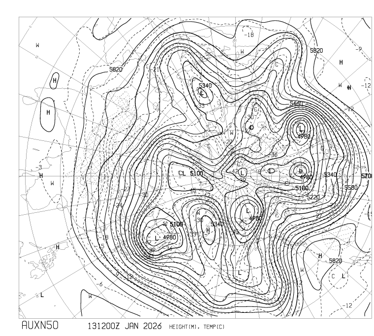 昨日の 500hPa 図です。中心が北極点、左斜め下の L 4980 の南側(北極点から見て外側)の等圧線が密になっている辺りが日本列島です。この時点では、日本列島の上空の偏西風は強いことが分かりますが、天候が目まぐるしく変わる原因になっています。もう一度 L 4980 に注目します。このL4980 の右のH5340、 その右のL4980 の関係に注目しましょう。さっき話したけど、高気圧や低気圧は北半球では左回りに回っています。ところが2つのL の間にHが割り込んでいますね。Hのことをブロッキング高気圧と言いますが、一番初めに注目したLは、東方、北方に移動しようにも、H5340にブロックされて南西方向(+235度)に移動するしか仕様がないのです。それが、バイカル湖付近の高気圧の強勢化なのです。