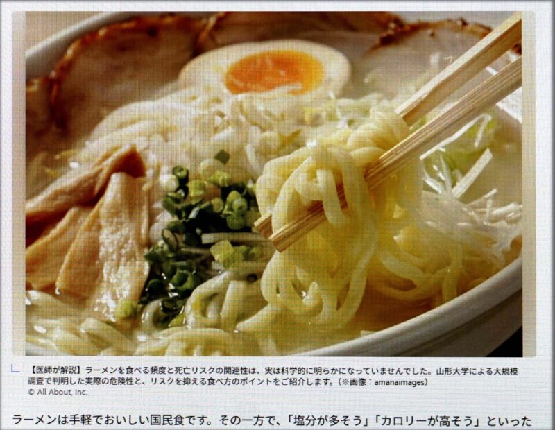 高齢者、週 ⒉ 回以上 ラーメンの露を全部飲む、アルコール :この 3つがそろうと、リスクが 2.2倍になるそうです。私はいつも思うのですが、ヒトはどうしてラーメン尾露に拘るんだろう? 私も、ラーメンを食べるたびに、汁は全部飲まないと店長に悪いなと思う。日本人を含む東洋人は、世界平均の2倍塩分を摂るそうだ。高野秀行の「酒を主食とする人々」では、アルコールだけなら健康被害はないが、塩分過多、脂肪過多が加わると、途端に病気が増えるそうだ。どうも、ラーメンの汁と酒は相性が悪いようだ。