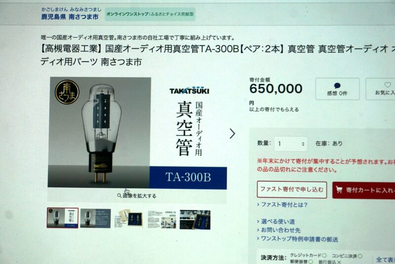 Web. を見ていたら、真空管がふるさと納税の返礼品になっていました。 300Bと言う真空管で、秋葉原の電気店で21,800円で売っています。しかし、ふるさと納税額で 65,000円だからオーディオに詳しいマニアなら誰も飛びつきません。300Bは戦前に製造された真空管で、「音が良い真空管」としてひと頃もてはやされました。今でもこの真空管や真空管を使ったアンプが高い値段で取引されています。製作記事は技術雑誌にも相変わらず掲載され続けています。しかし、同じ型番の真空管を使っても、メーカーごと、あるいは1球ごとに特性が異なるので、測定器を持たない、あるいは測定器を使えないマニアには猫に小判です。それで、300Bの音を聞きたいマニアは、地方都市のガレージ工場で作ったアンプを買うことになります。真空管は経年劣化が激しいので、常に補修部品が必要です。製造したメーカーに問い合わせても、すでにそのメーカーは存在しないことがママあります。 そうして幻の球 300B を求めて、高額のふるさと納税に頼ることになります。(秋葉原で買えば安いのに・・・・)