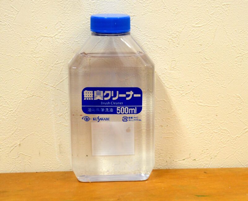 油絵の筆を洗うのに使うクリーナーです。クリーナーを開放容器に入れて、蓋をせずに絵筆を突っ込んでおくのに最適です。この溶液は石油系ですが、ガソリンや灯油のような臭いがしません。この溶液は、油絵具を誤って衣服に付けてしまった時、布に浸みこませて拭き取るのにも使えます。なかなか取れないけど、丁寧に吹けばほぼ完ぺきに取れます。キシレンやトルエンなどの有機溶媒でも拭き取れるのですが、後が染みになってしまいます。油絵具の顔料は鉱物です。絵の具の基材は植物系の樹脂です。植物樹脂や石油系の溶媒は絵の具に含まれる顔料を融解しません。一方、有機溶媒は顔料を融解してしまい、染料として働くため衣類を汚します。 布に染料が浸み込むと絶対に取れません。