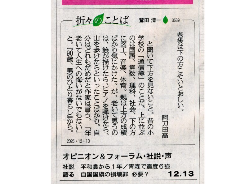 あまり年寄りの人生を言い当てていて感心した。「年よりは学校の通信簿の下の方の項目に気が向かう」と言う意味だ。私の場合も、図工は油絵、美術館問題、音楽はピアノと音楽鑑賞、体育はマレット、スキー、水泳だ。山は若いころはさんざ登った。
