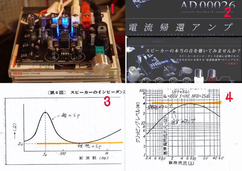 面白いアンプを買いました。値段は1万円くらいと安いです。通常のアンプとの違いを記載します。 図3 普通のスピーカーのインピーダンス(抵抗)は黒い線で示されます。コーン紙の質量とダンパーの弾性の影響で共振が起き、インピーダンスは共振周波数で著しく上昇し、一旦下がって再び上がっていきます。黄色の線は理想のスピーカーの周波数特性です。 図4 黒線は通常のアンプの負荷抵抗と最大出力(クリッピング・レベルと表記)の関係です。負荷インピーダンスが適正なら十分な出力がありますが、負荷インピーダンスが 小さすぎたり大きすぎたりすると、出力が下がります。特にスピーカーの入力周波数が図3の f0 で入力インピーダンスが上昇するので、図4の 負荷抵抗(黒線)は右にシフトして出力が下がります。理想のスピーカーは作れないわけではありませんが非現実的です。それを解決したのが、図4 の黄色線の特性を持つ電流帰還アンプです。共振周波数での出力低下は、低音特性に影響します。通常のアンプと通常のスピーカーでは痩せた音しか出ませんが、電流帰還アンプでは豊かな低音が出ます。このアンプのスペックを見ると、出力がたったの 0.5w ですが、歪みの少ない良い音がします。きれいな高音で、再生装置とは思えないほど自然な高温が出ていました。