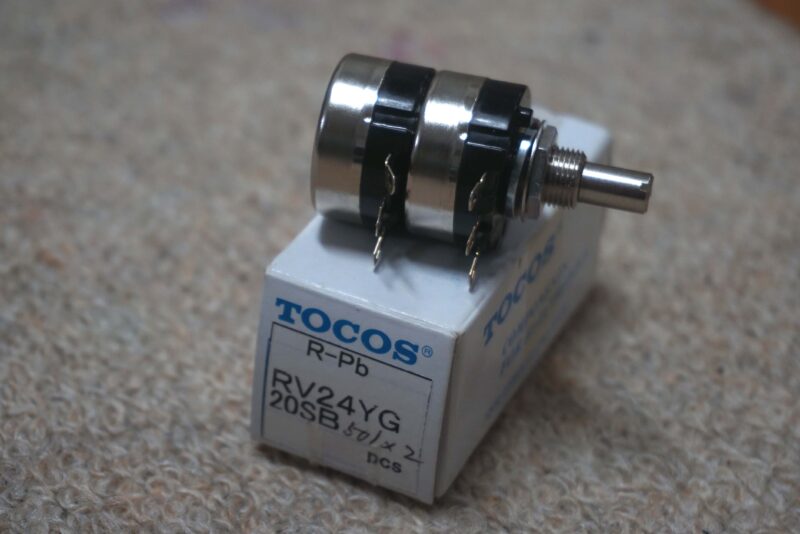一般的には、略して「ボリューム」と言い、日本語にすれば「音量調節器」です。須坂の部品屋で買いました。手作り品で、値段は高かったけど(税抜き@2,800円)、大事に使おうと思って買いました。本体も良いけど、外箱が気に入りました。50/×2 の字が手書きなのが特に気に入りました。同じものを秋葉原の通販店のカタログを見たら、税抜き@3,800円でした。1,000円得した!