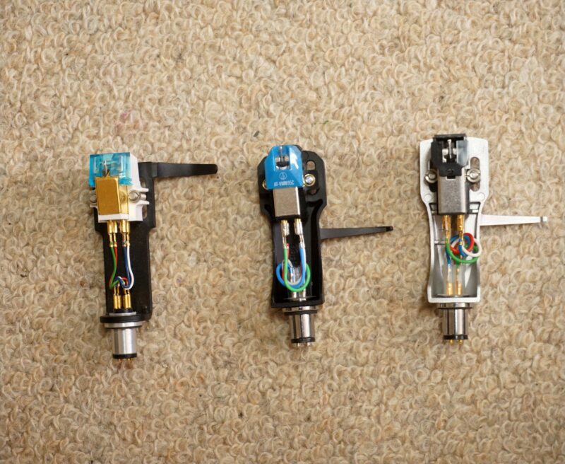 MM(ムービング・マグネット)型カートリッジです。左から NAGAOKA DJ-03D  普及品です。使いやすいです。  真ん中 オーディオ・テクニカ  AT-VMM95C     通常のMM型と高級品のMC型の中間の音が出るとされています。       右 GRIT GROOVE社(国内メーカー) スタイラス KAGURA BLACK] CORE  本体AT 3600L搭載    スタイラスが人工ダイヤ(黄色)で硬度が硬くて丈夫、カンチレバーは太めが売りです。私にはその違いは良く分からない。