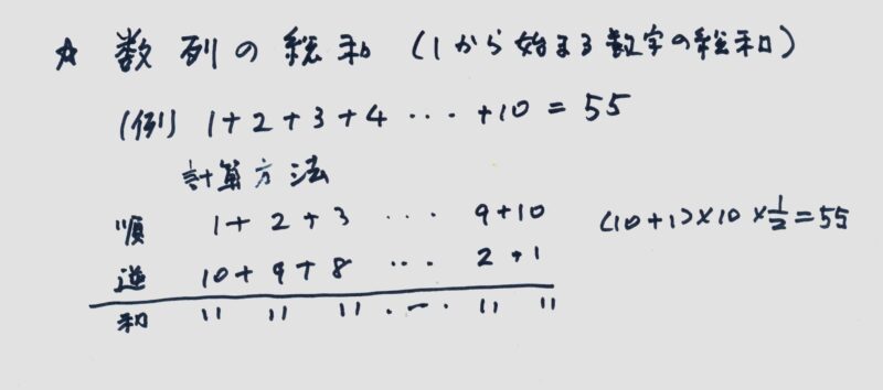 そろばんの練習で、よくやりました。1 から 10 まで足すと、55 ですね。 他のケースではどうでしょうか。1 ~100 までやって見て下さい。上段を順に 1 2 3 ・・・・99 100 下段に 100 99 ・・・・3 2 1 上段と下段をそれぞれ足せば、 101 101 101・・・・・101 101 で全部で 100回分あるから、 総合計は ?? 上段と下段 2回分なので ???