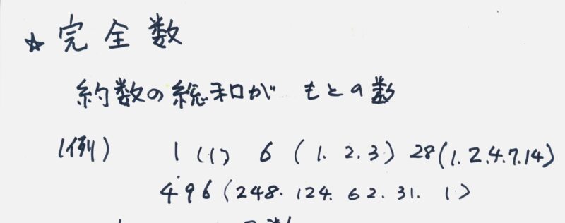 約数を1 から順に 2 ,3,4,5,6,・・・・と上げて行って、割りきれたらその数を加えます。例えば 28 は、1,2,4,7,14 で、総和が 28 だから完全数です。3桁だと大変ですよ。むかし私はPCが走りだだしだった頃、BASIC 言語でプログラミングして調べたことがあります。4 桁の完全数を調べるのに、当時のPCは遅かったので、計算するのに一昼夜かかりました。