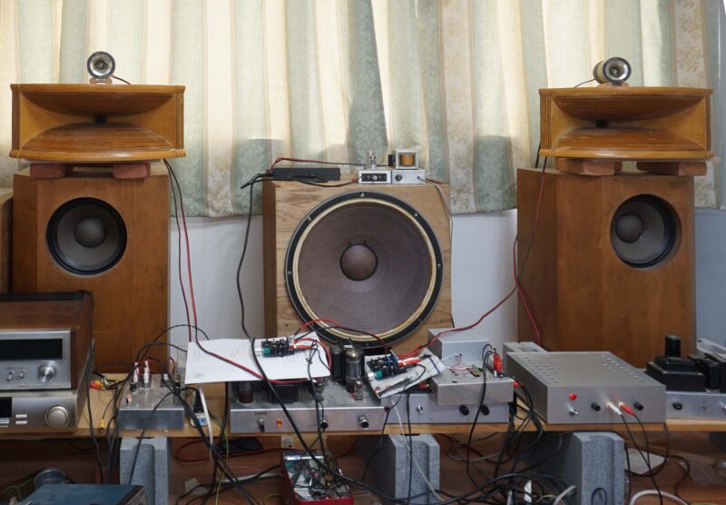 真ん中の口径 45cmのスピーカーはセンター・ウーファーです。100Hz 以下の超低音用です。普段はネットを張ってボロを隠しています。両脇のスピーカーは上から高温用、まん中が中音用、下が低音用です。このあいだ、中、高音用のアンプを付け替えたのですが、その時超低音用だけ、位相が狂っていることに気付きました。近くで聞くと耳が詰まったような感じがするので気付きます。2年以上それに気付かなかったです。私の耳は大したことは無いなあ。