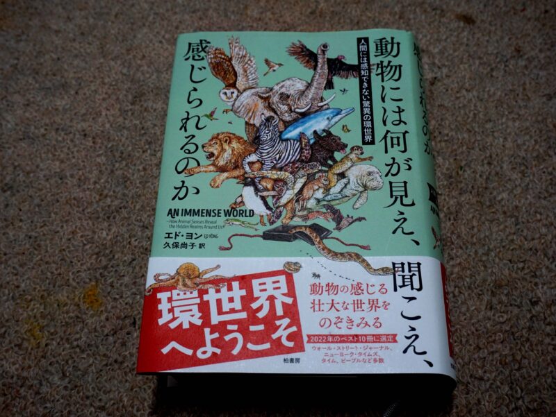 動物には何が見え、聞こえ、感じられるのか」 エド・ヨン著 久保尚子訳  環世界とは耳慣れない言葉だが、「動物はヒトとまったく異なる感覚の中で生きている」という。そのような感覚の違いを環世界というのだそうだ。本文だけで508p に及ぶ大著である。どのくらいの動物が出てくるか及びもつかない。そして、それらの動物がみな異なった環世界を持っているのだ。色だって、全種の動物がヒトと同じように物が見える訳では無い。例えば、犬や牛は赤が認識できない。闘牛で牛が闘牛士が持つ赤い布は、牛は赤色を認識しないそうだ。観客が興奮するだけだそうだ。ただし、「牛は色彩が認識できない」とよく言われるが、ウシの名誉のために言ったおくと、牛はすべての色が見えないわけではなく、たまたま赤色を赤色と認識できないだけだ。網膜に存在する杆状体の違いで視覚が異なる。