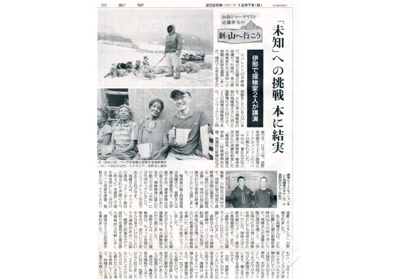 信濃毎日新聞社(信毎)が主催する「梅棹忠夫賞」受賞者の、角幡唯介、高野秀行氏の講演会のことは、以前の「新聞を読んで」で取り上げた。この記事は信毎でも載ったが、朝日新聞の方が大きく載った。記事を読んだら、2人とも朝日新聞社の記者だったのだ。道理で・・・