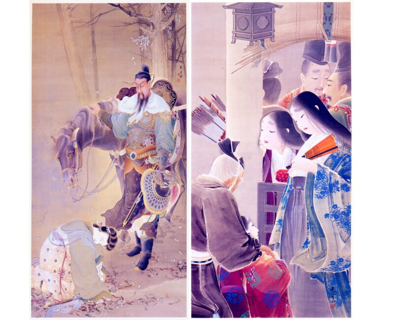 菊地契月の大作です。2006年に信濃美術館で「菊地契月展」が開催されたときに作られた画集からコピーしました。契月は中野町の出身で、京都で修行して後に日本画壇を牽引した美術家です。左は垓下別離、右は福原故事で、修業時代に大きな画展に出品した大作だと思います。たまたま中野町が買い上げ、今は中野市喬育委員会の所有物です。重要文化財級の名画ですが、中野市では文化財としての所有登録さえしていません。それでいて、彼女お借りしますの画像を中野市の町おこしのイラストに使っているのは変です。
